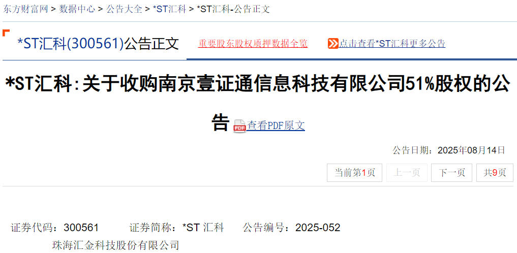 股票索赔平台微信公众号“公义之星”讯,2025年8月14日,*ST汇科(汇金科技300561)公告显示,公司拟以自有资金2,907万元收购共计9名交易对方合计持有的南京壹证通信息科技有限公司51%股权。交易完成后,壹证通将成为公司控股子公司,纳入公司合并报表范围。