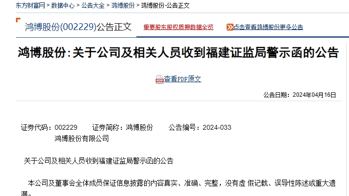微信公众号“公义之星网“资讯,鸿博股份(002229)于2023年7月8日披露收到中国证监会福建监管局下发的《关于对鸿博股份有限公司及相关责任人员采取出具警示函措施的决定([2024]15 号)》,认定鸿博股份2023 年度业绩预告违反了《上市公司信息披露管理办法》(证监会令第 182 号,以下简称《管理办法》)第三条第一款的规定。上海海汇所梁律师索赔(微信号:15601608866)提示:已有索赔投资者获得一审胜诉,依据《证券法》及相关司法解释,凡自2024年1月11日(含)至2024年4月12日(含)期间买入,并于2024年4月12日闭市后当日仍持有股票的受损投资者仍可在【公义之星网www.gyzx365.com】输入姓名、股数关注申请赔偿投资损失。特别提示:股票索赔的是历史法定损失金额,与目前是否持有股票没有任何关系。