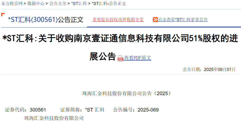 2025年9月1日,汇金科技公告显示:壹证通对其关联方江苏智慧提供的借款,江苏智慧已于2025年8月26日前全额偿还完毕。壹证通于2025年8月29日办理完成股东变更登记手续,公司持有壹证通51%的股权,壹证通成为公司的控股子公司,纳入合并报表范围。