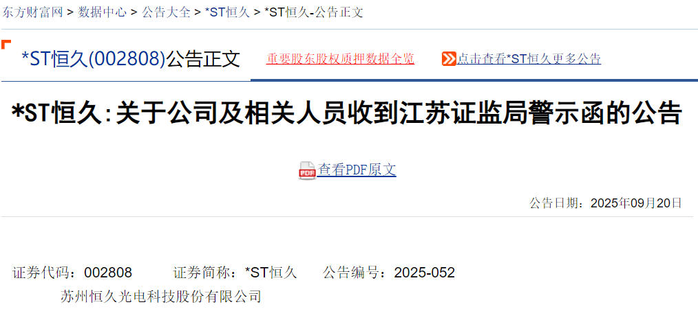 股票索赔平台微信公众号“公义之星”讯,2025年9月20日,*ST恒久(恒久科技002808)公告显示:因存在内幕信息知情人登记管理不规范、登记范围不完整,公司收到江苏证监局出具的《警示函》。此前,因相同事项,公司已收到深交所出具的《监管函》。