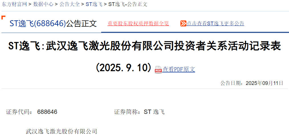 股票索赔平台微信公众号“公义之星”讯,2025年9月9日,ST逸飞(逸飞激光688646)在接受特定对象调研时表示: