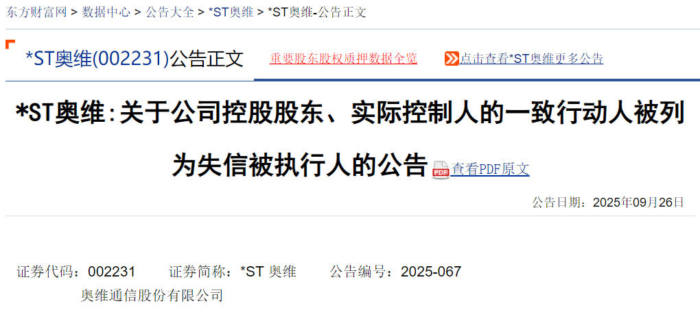 股票索赔平台微信公众号“公义之星”讯,2025年9月26日,*ST奥维(奥维通信002231)公告披露,公司控股股东、实控人的一致行动人上海东和欣被上海市松江区人民法院列为失信被执行人。截至2025年6月30日,上海东和欣及其关联方仍有18,607.30万元资金占用款尚未偿还,其被列为失信被执行人将导致公司收回资金占用款存在较大的不确定性。