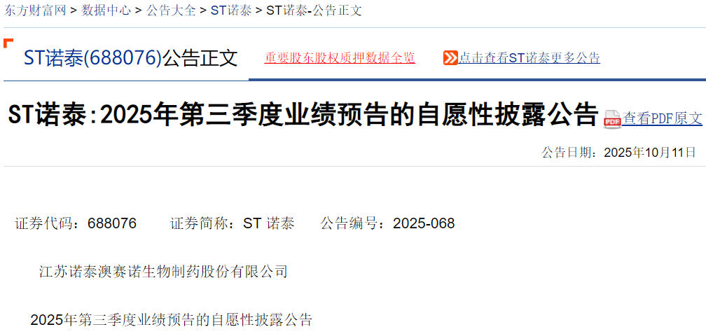 股票索赔平台微信公众号“公义之星”讯,2025年10月11日,ST诺泰(诺泰生物688076)公告披露,经财务部门初步测算,预计2025年第三季度实现归属净利润1.3亿元到1.4亿元,同比增加5.62%到13.74%;扣非净利润为1.3亿元到1.4亿元,同比增加3.76%到11.74%。