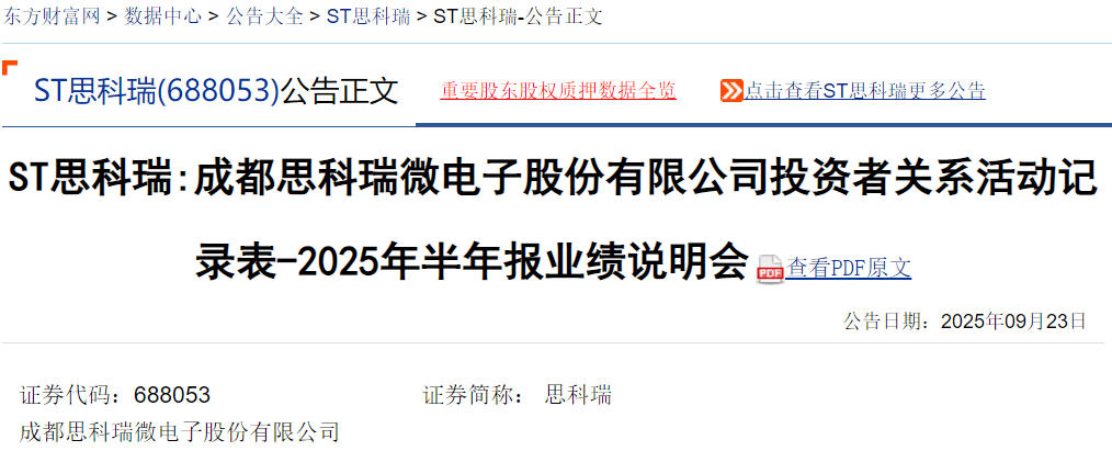 股票索赔平台微信公众号“公义之星”讯,近日,ST思科瑞(688053)在2025年半年度业绩说明会上表示: