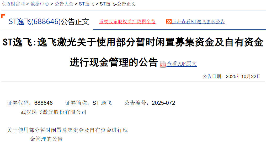 股票索赔平台微信公众号“公义之星”讯,2025年10月22日,ST逸飞(逸飞激光688646)公告披露,公司拟使用不超过45,000万元的部分暂时闲置募集资金进行现金管理;公司及子公司拟使用不超过50,000万元的部分暂时闲置自有资金进行现金管理。暂时闲置募集资金拟购买安全性高、流动性好、具有合法经营资格的金融机构销售的有保本约定的投资产品,产品期限不超过12个月。