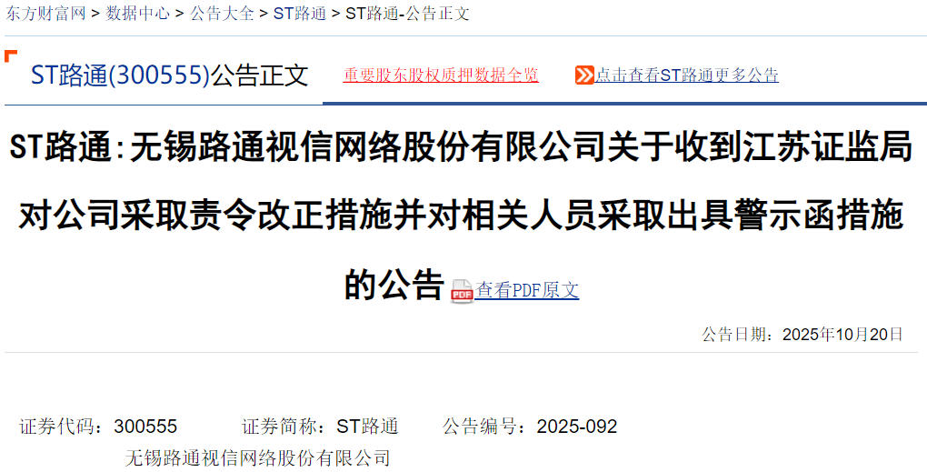 2025年10月22日,路通视信公告显示:公司于2025年9月18日召开第五届董事会第十五次会议,同意召开2025年第二次临时股东大会审议相关议案。根据公司《章程》第四十八条第二款规定,在作出董事会决议后的5日内发出召开股东会的通知,但截至2025年9月26日,公司仍未发出召开股东会的通知。上述事项违反了《上市公司股东会规则》(证监会公告〔2025〕7号)第三条规定。江苏证监局对公司采取责令改正的行政监管措施,对邱某卫采取出具警示函的行政监管措施。