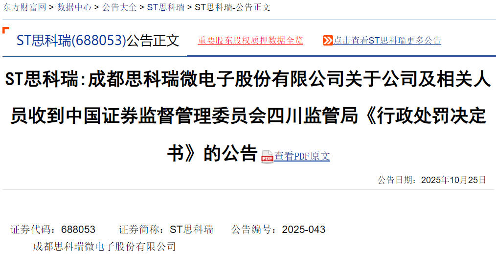 事件回顾:2025年1月18日,思科瑞公告收到中国证监会的《立案告知书》(编号:证监立案字0082025001号),因涉嫌信息披露违法违规,中国证监会决定对公司立案。2025年9月20日,思科瑞公告收到中国证监会四川监管局的《行政处罚事先告知书》(川证监处罚字【2025】6号)。