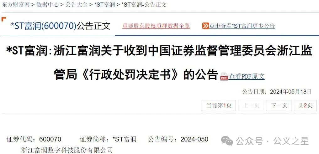 股票索赔平台公义之星网(www.gyzx365.com)讯,2024年5月18日,*ST富润(浙江富润600070)公告收到中国证监会浙江监管局的《行政处罚决定书》(〔2024〕18号、〔2024〕19号、〔2024〕20号)。上海海汇律所梁律师(微信号:15601608866)提示:浙江富润索赔案已有投资者一审胜诉。2021年4月27日(含)至2023年4月27日(含)期间买入该股,且在2023年4月27日闭市后当日仍持有的受损投资者可在【公义之星网】登记申请索赔挽损。股票索赔的是历史法定损失金额,与目前是否持有股票没有关系。