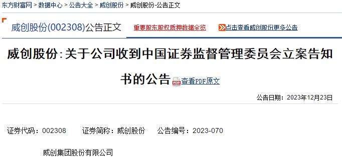 公义365网(www.gyzx365.com)讯,2023年12月23日,威创股份(002308)公告到中国证监会出具的《立案告知书》(编号:证监立案字0062023038号)。因涉嫌信息披露违法违规,中国证监会决定对公司立案。上海海汇律所梁律师(微信号:15601608866)提示:2023年12月22日收盘后仍持有的投资者可在【公义365网】登记索赔挽损。