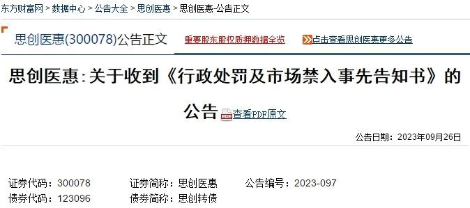 公义之星网(www.gyzx365.com)讯,2023年9月26日,思创医惠(300078)公告披露,公司于9月25日收到中国证监会浙江监管局的《行政处罚及市场禁入事先告知书》(浙处罚字[2023]28号)。上海海汇律所梁律师(微信号:15601608866)提示:2018年2月7日(含)至2021年4月29日(含)期间买入,且在2021年4月29日闭市后仍持有的受损投资者可在【公义之星网】登记申请索赔挽损。股票索赔的是历史法定损失金额,与目前是否持有股票没有关系。