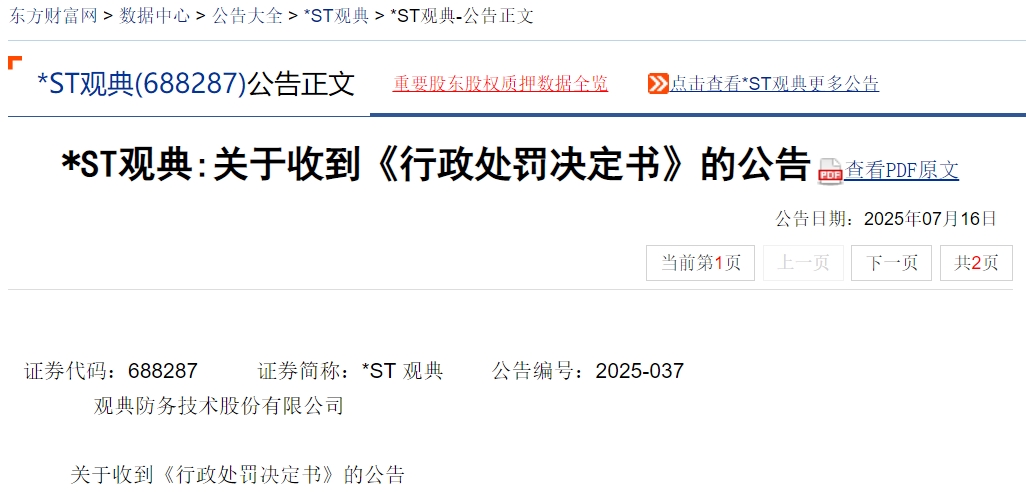 2025年7月8日,观典防务公告收到中国证监会北京监管局的《行政处罚事先告知书》(〔2025〕5号)。