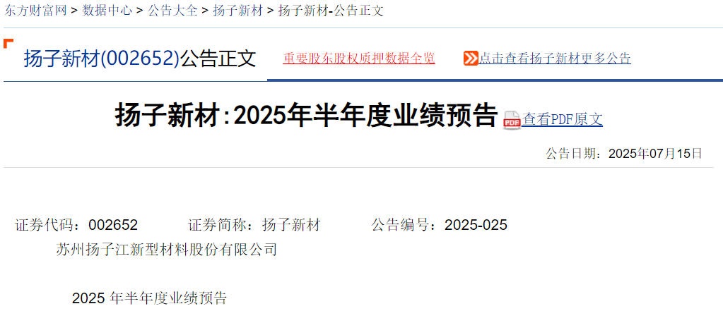 股票索赔平台微信公众号“公义之星”讯,近日,扬子新材(002652)发布的《2025 年半年度业绩预告》显示:预计2025年半年度归属净利润亏损1,100万元-1,400万元(上年同期为盈利1,588.84万元);扣非净利润亏损亏损1,150万元-1,450万元(上年同期亏损1,012.07万元);基本每股收益亏损0.0215元-0.0273元。