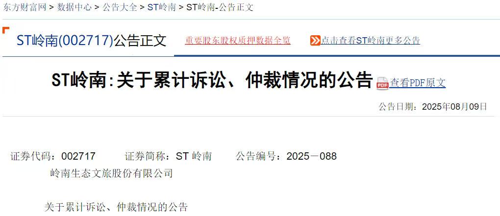 股票索赔平台微信公众号“公义之星”讯,2025年8月9日,ST岭南(岭南股份002717)公告披露,截至2025年8月7日,公司及控股子公司连续十二个月内新增尚未披露的诉讼、仲裁事项的涉案金额合计约为13,856.81万元,涉案金额累计达公司最近一期经审计归属于母公司净资产的13.02%。