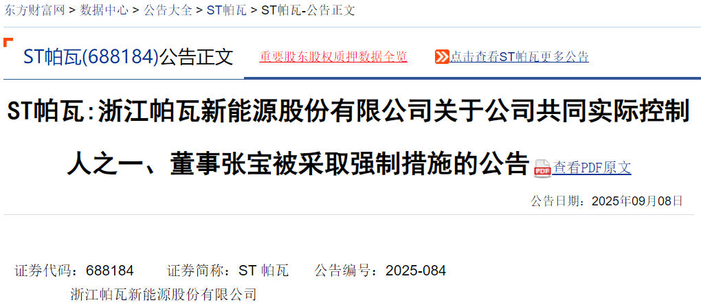 2025年8月4日,帕瓦股份公告显示,公司共同实际控制人之一、董事张某涉嫌职务侵占被公安机关立案侦查;9月8日公司公告,张某被采取强制措施。