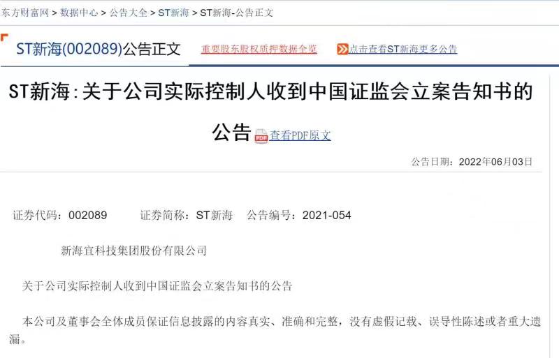 微信公众号“公义之星网”末班车专辑,2022年6月2日,ST新海(002089)披露实控人昨天收到中国证监会下发的《中国证券监督管理委员会立案告知书》(编号:证监立案字0102022004号)。上海市梁律师索赔(微信号:15601608866)提示:该股票曾爆雷,依据《证券法》和最高院2022年关于证券虚假陈述侵权案最新司法解释,诉讼时效将在2022年7月22日到期,凡自2018年11月20日(含)至2019年4月26日(含)期间以公开竞价方式买入,且在2019年4月26日闭市后当日仍持有股票的受损投资者可在【公义之星网】输入姓名、股票代码申请股票损失赔偿。小义索赔特别提示:股票索赔的是历史法定损失金额,与目前是否持有股票没有任何关系。