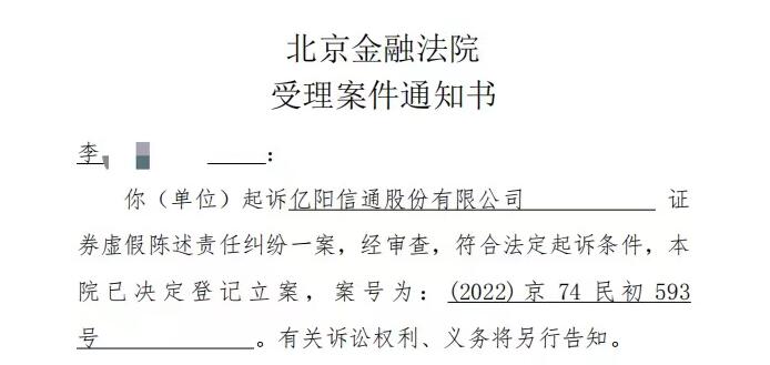 微信公众号“公义之星”雷股资讯,本所代理的亿阳信通(ST信通,600289)投资人股票索赔案已成功在北京金融法院成功立案,起诉上市公司赔偿投资人因其证券虚假陈述造成的投资损失。上海市梁律师索赔(微信号:15601608866)提示:该股票曾爆雷,依据《证券法》和最高院2022年关于证券虚假陈述侵权案最新司法解释,凡自2016年1月8日(含)至2017年12月7日(含)期间以公开竞价方式买入,并于2017年12月7日闭市后当日仍持有股票的受损投资者可在公义之星网输入姓名、股数申请赔偿投资损失。小义索赔特别提示:股票索赔的是历史法定损失金额,与目前是否持有股票没有任何关系。