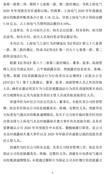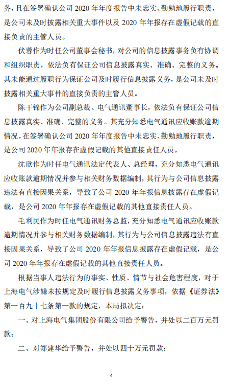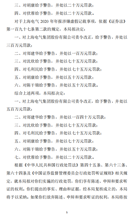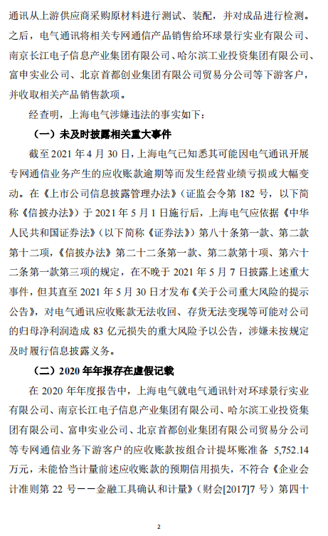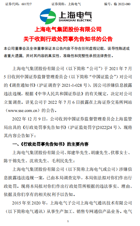 2022 年 12月 10 日,上海电气(601727)披露收到中国证券监督管理委员会上海监管 局出具的《行政处罚事先告知书》(沪证监处罚字[2022]24 号)《告知书》显示:(1)上海电气未及时披露相关重大事件;(2)2020年报存在虚假记载(3)证监会拟对上海电气处以200万元罚款。