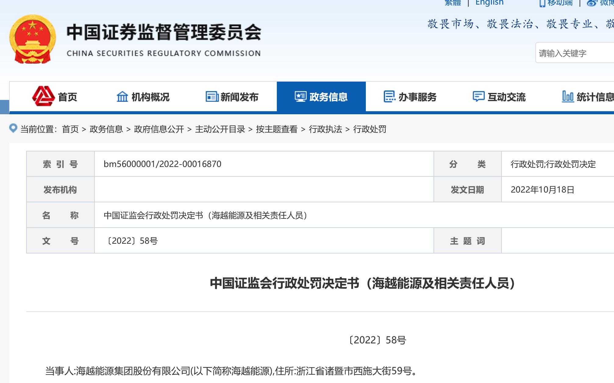 违规事实:证监会认定海越能源、海南承睦商业贸易有限公司、海南禧越投资有限公司、海南科赛贸易有限公司系由海航集团实际控制的公司,由此导致海越能源未按规定披露非经营性关联交易,具体如下: 2020 年 2 月 25 日、4 月 8 日、4 月 9 日,海越能源向海南承睦分别提供 4,000 万元、5,000 万元、68,533.49 万元;2020 年 4 月 9 日、4 月 21 日,海越能源向海南科赛分别提供 36,000 万元、24,000 万元;2020 年 5 月 25 日、5 月 26 日,海越 能源向海南禧越分别提供 41,420 万元、19,316.79 万元。以上合计 198,270.28 万 元,占海越能源《2020 年半年度报告》记载的净资产绝对值 63.19%。 行政处罚:对海越能源责令改正,给予警告,并处以一百万元罚款。