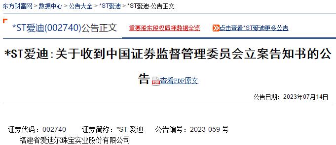 微信公众号“公义之星”股票索赔平台讯,2023年7月14日,*ST爱迪(爱迪尔002740)发布公告称,公司于7月13日收到中国证监会出具的《立案告知书》(证监立案字0262023007号),因公司涉嫌信息披露违法违规,根据《中华人民共和国证券法》、《中华人民共和国行政处罚法》等法律法规,中国证监会决定对公司立案。